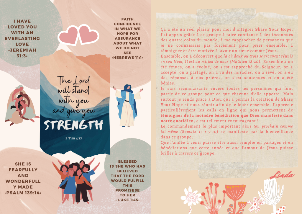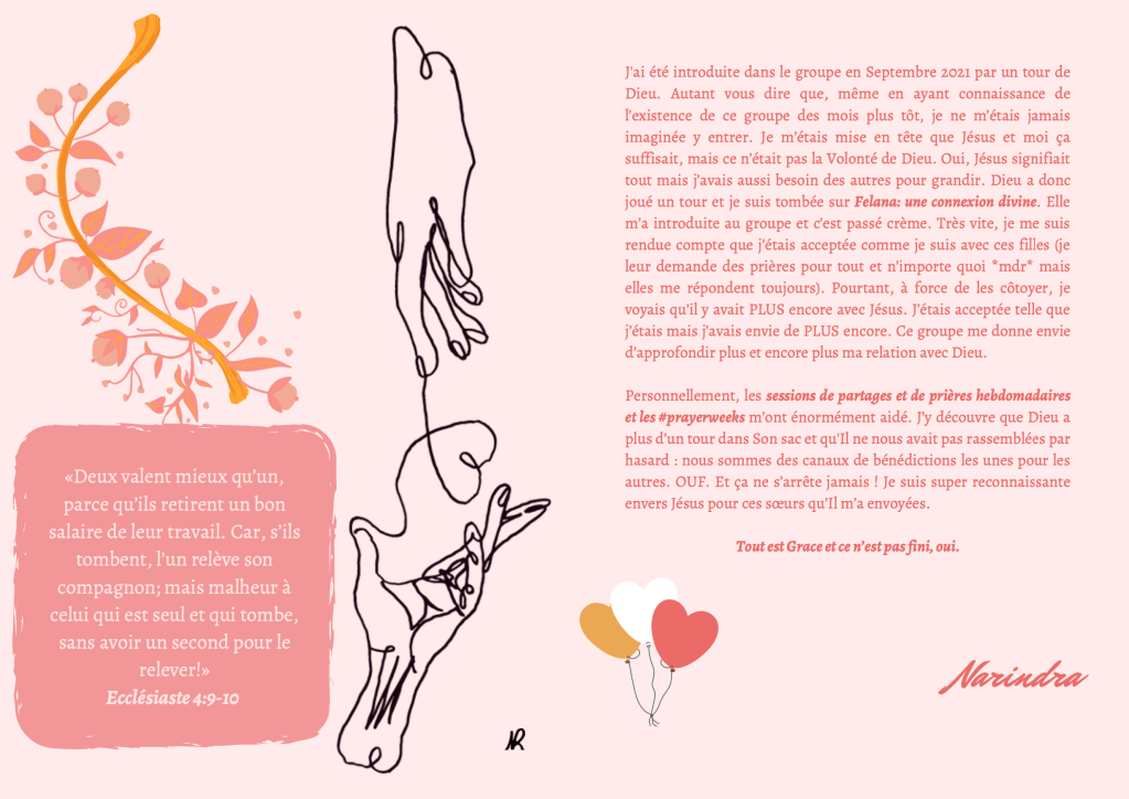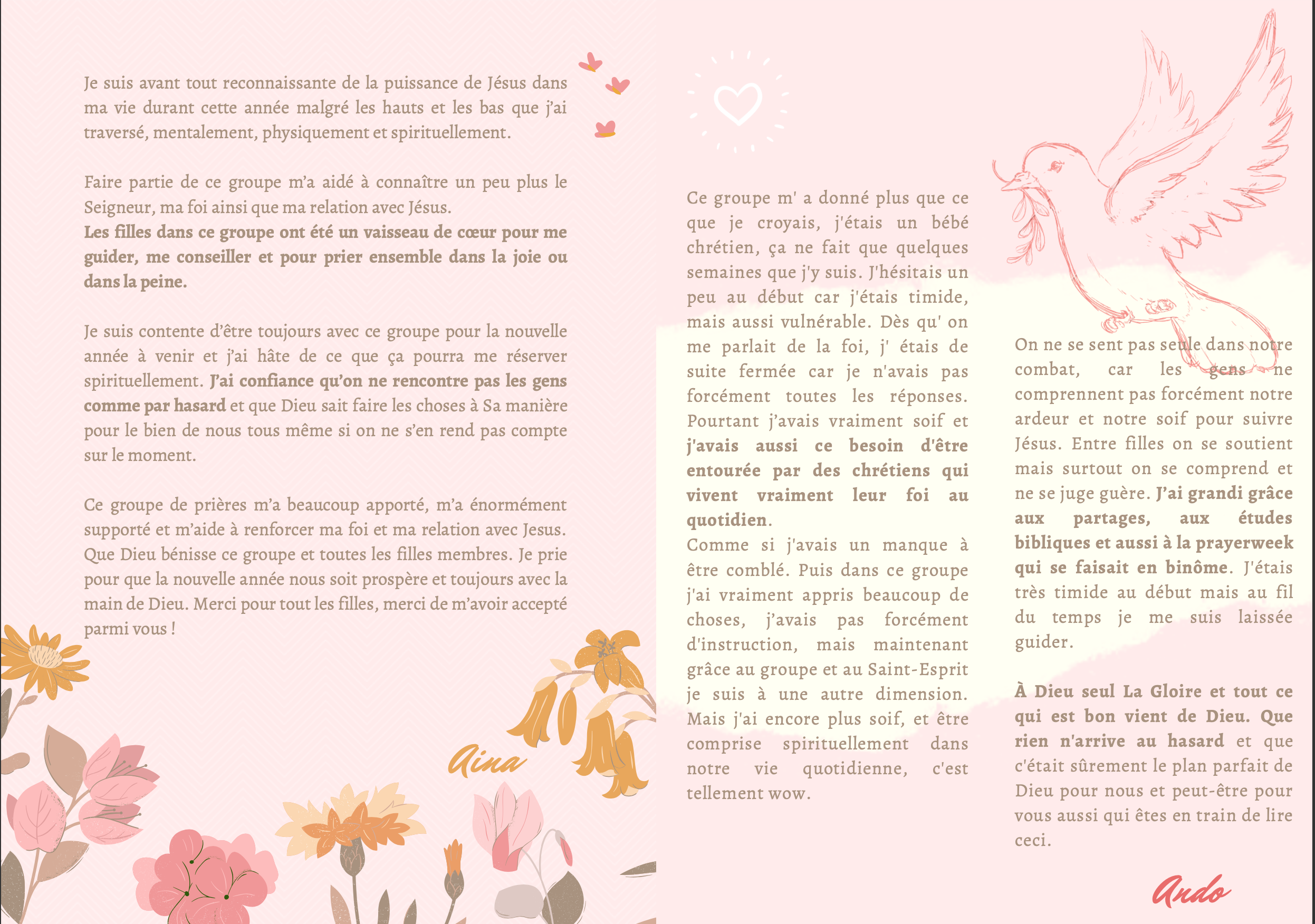 Aussi, nous avons surtout à cœur d’encourager d’autres personnes à travers ce que nous avons vécu et d’être un canal de bénédiction. Chacune d’entre nous a vécu cette année d’une manière différente mais, toutes, nous avons pu expérimenter encore et encore à quel point notre Dieu est bon.