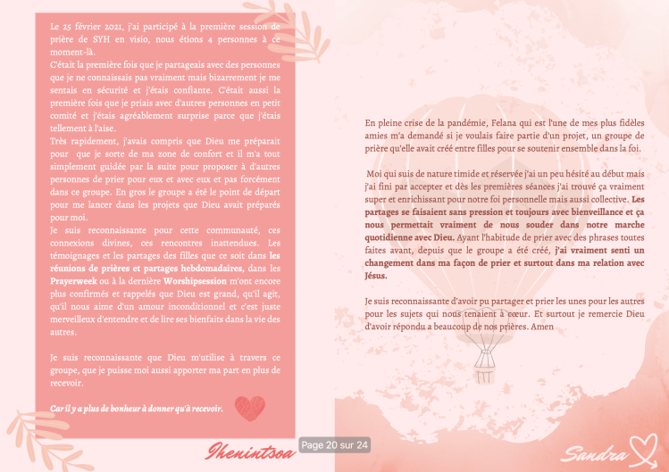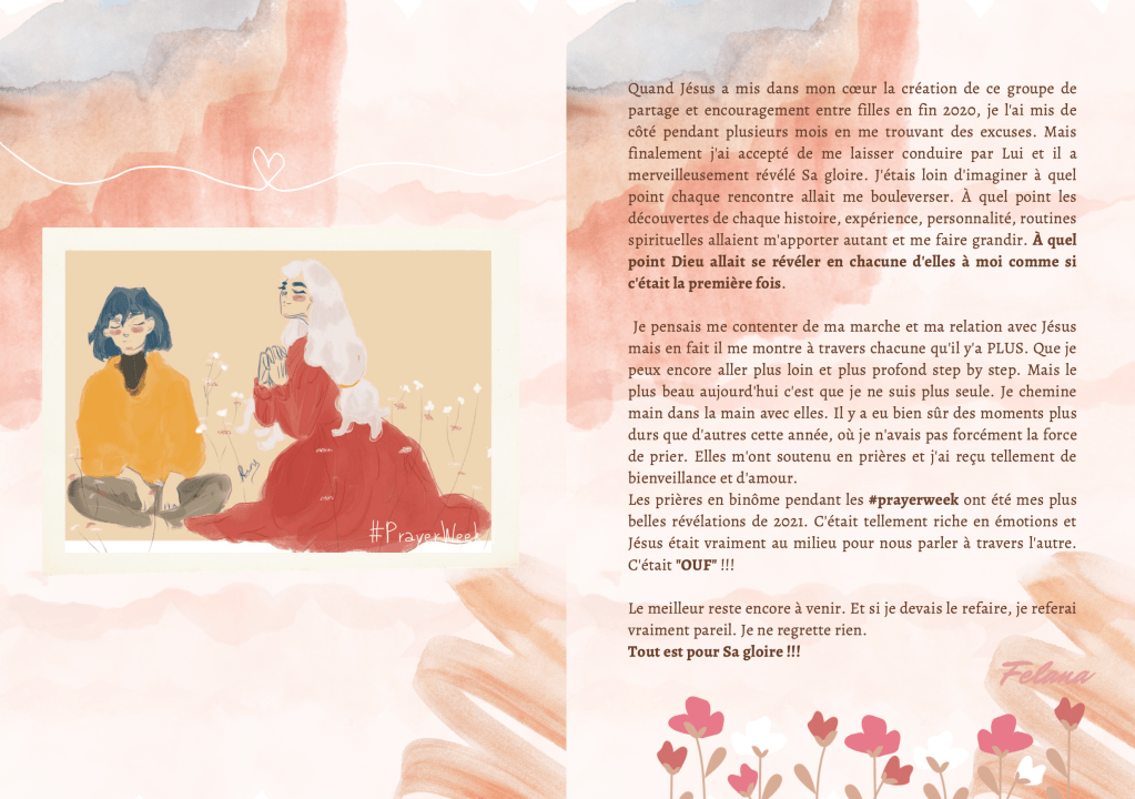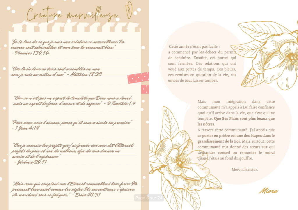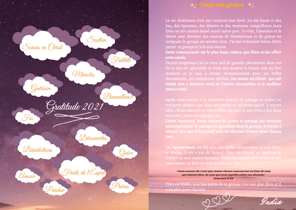 L’année dernière en 2021, nous avons sorti notre premier journal de gratitude pour témoigner et raconter les bienfaits de Dieu dans nos vies. Le relire nous a permis de nous rappeler les bonnes choses, d’où est ce que nous sommes parties et de comment nous avons évolué depuis.